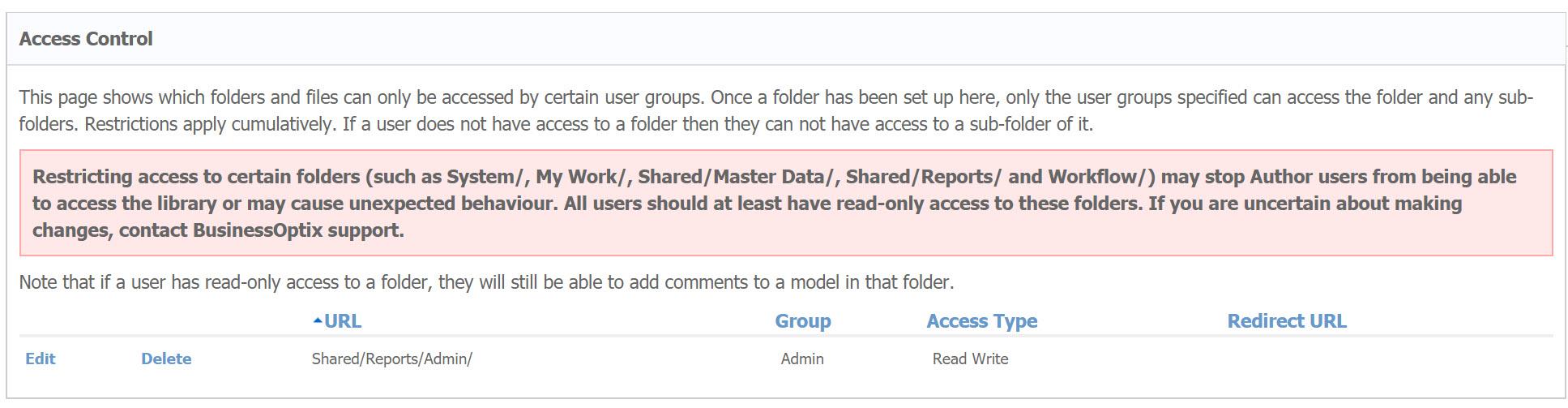 Restricting access to certain folders may stop Author users from being able to access the library or may cause unexpected behaviour. All users should at least have read-only access to these folders.  Note that if a user has read-only access to a folder, they will still be able to add comments to a model in that folder.
