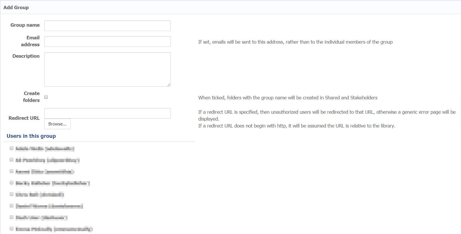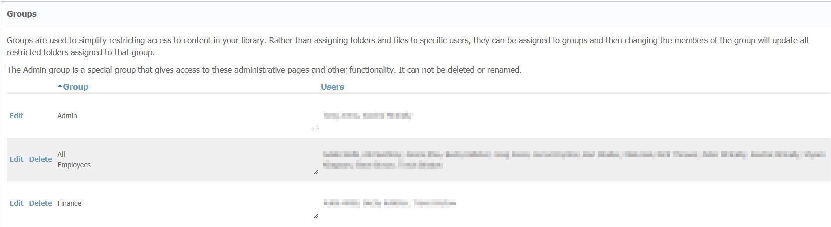 Groups are used to simplify restricting access to content in your library. Rather than assigning folders and files to specific users, they can be assigned to groups and then changing the members of the group will update all restricted folders assigned to that group.