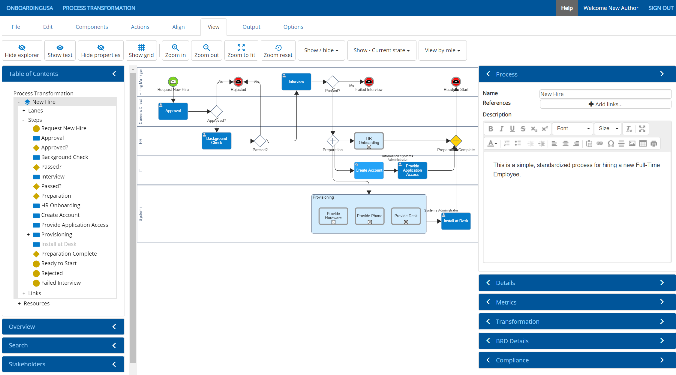 6. When the new model opens in editor, click the lane on the screen to delete the starter diagram, then click Paste from the Edit menu. The previous model diagram and details will then paste into the editor. Click Save from the File menu to save the new model.