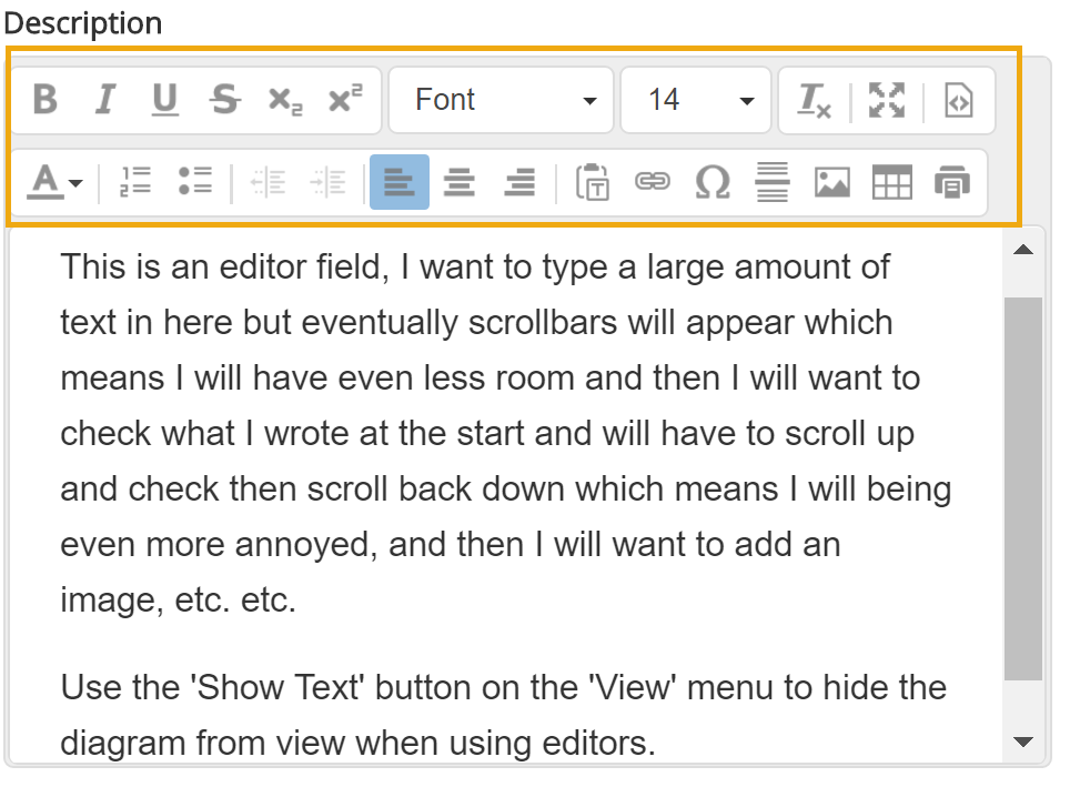 When working in our html editor fields (editor fields are the text entry areas that allow formatting i.e Work instruction or description fields) typically they have a toolbar as seen below.