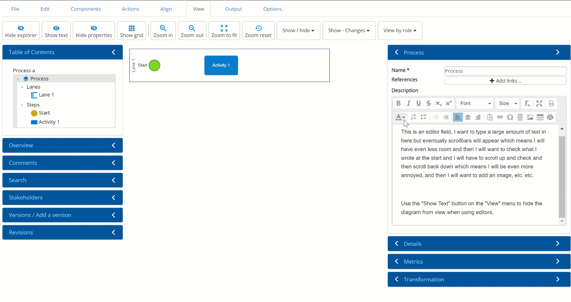 Click the 'Show Text' button to create more space for the editors, click on it again to go back to diagram view.