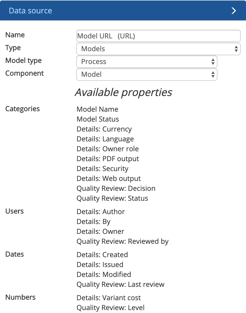 When you set-up a model or form data source you need to select the model (or form) type. And for models, you then also need to select the component type within the model that holds the properties you want to put on your dashboard. For example, this data source relates to Process Models