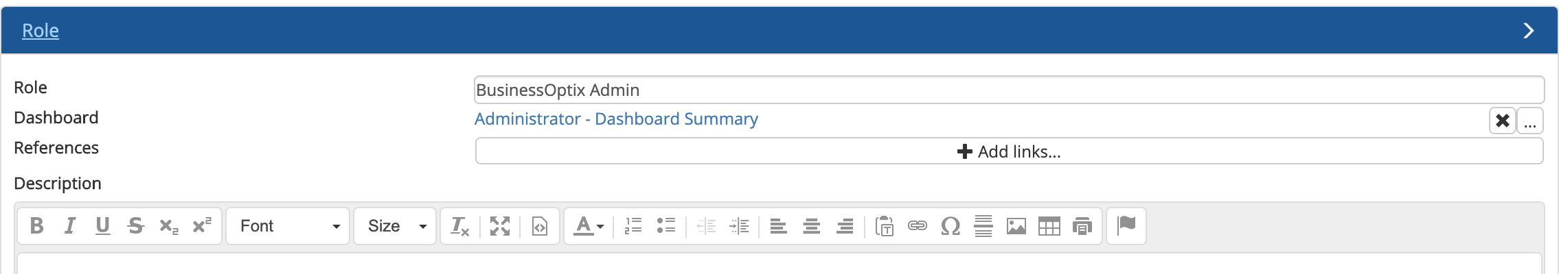 The home page also supports the option of targeting dashboard contents at functional roles, e.g. business analyst, tester, operations supervisor. Functional roles are not pre-defined by BusinessOptix but are set-up in your library Roles Master Data file. Create a functional role and then add a dashboard in the same way as you do for the BusinessOptix User Types.