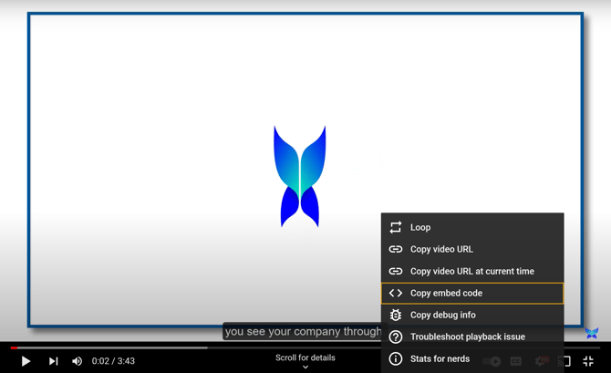 On YouTube, navigate to the video, right‑click, and select Copy embed code.