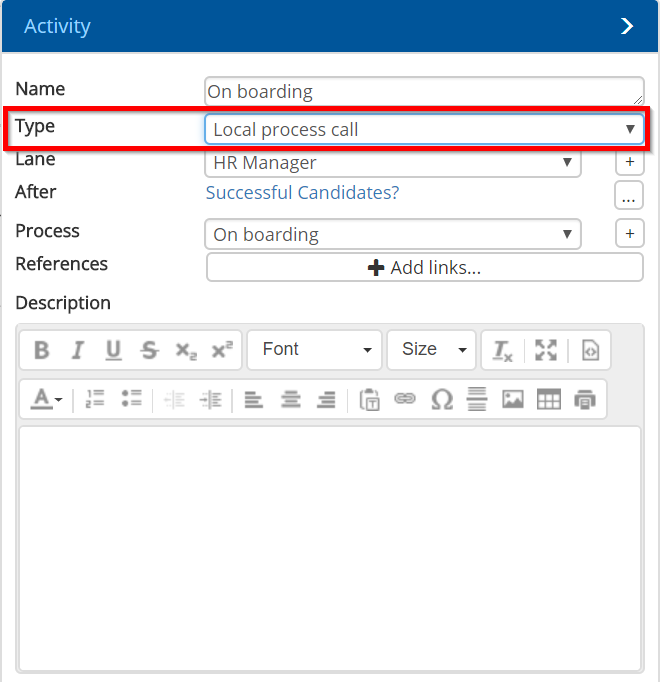 Click on the activity component you wish to add a sub-process to. In the properties inspector on the right, next to 'Type', select 'Local Call Process' from the drop down menu.