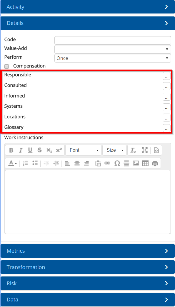 Activities that make up a model can have master data such as roles, systems, locations, etc allocated to them.