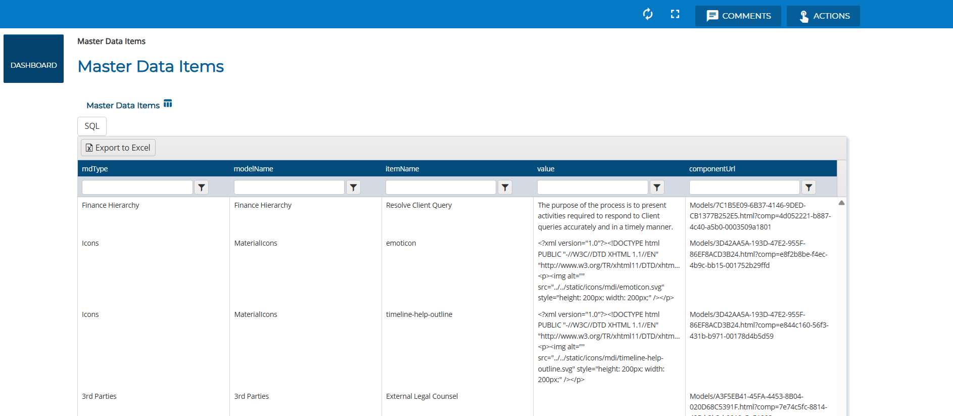 The BusinessOptix data model has been designed to easily store the different types of data captured in the model, it's components and the properties associated with the component. Please review the BusinessOptix Data Model to understand the structures and contact your support team if you require assistance.