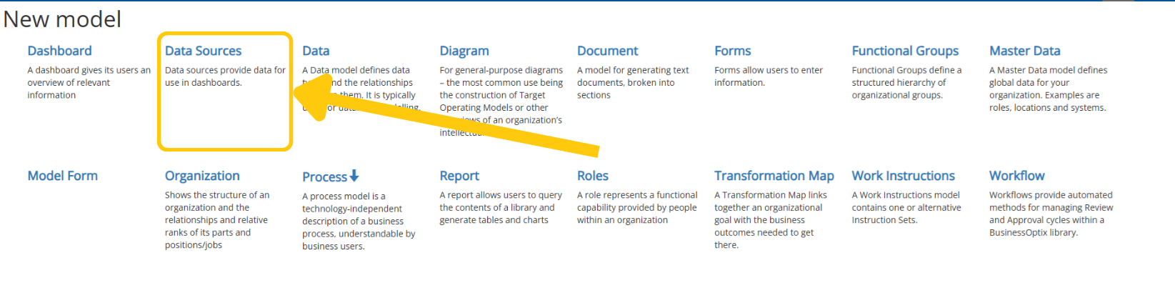 This set of instructions will guide you through how to configure a data source in order to retrieve information about models or forms that is stored in your BusinessOptix library.