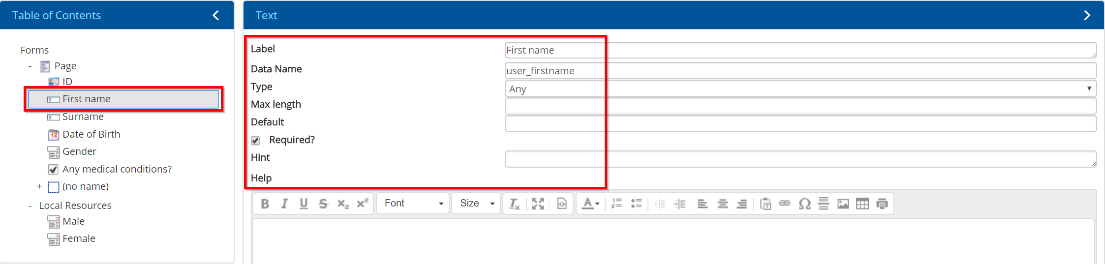For example, if the first name is needed, add a text field to the form. This will open up the text field details where the relevant sub fields need to be filled in.
