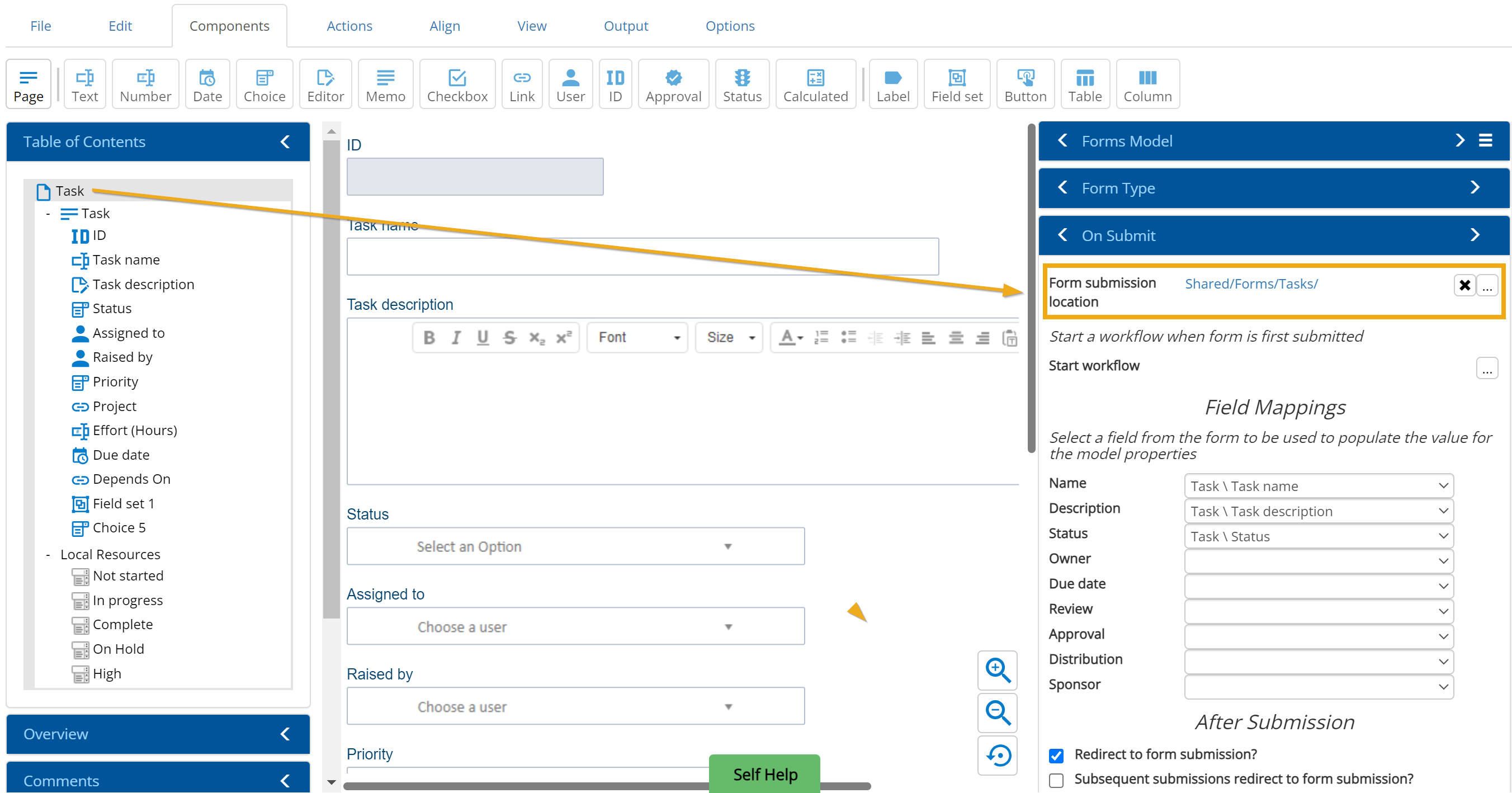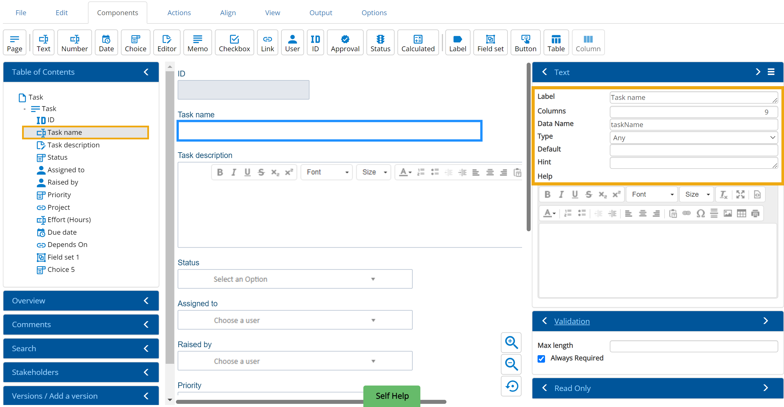 For example, if task name is needed, add a text field to the form. This will open up the text field details where the relevant sub fields need to be filled in.