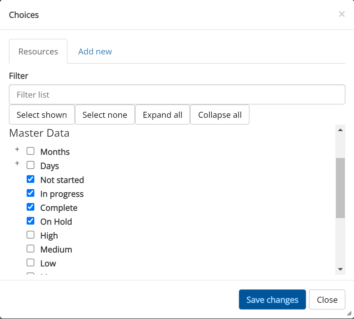 By clicking on the 'Edit' button, a list of choices will open where a new choice can be added as a local resource.