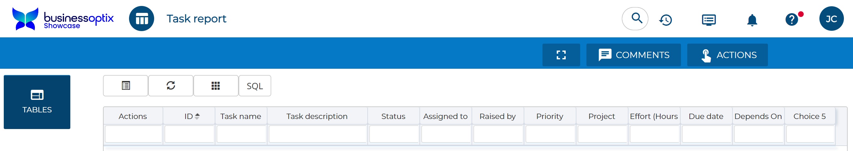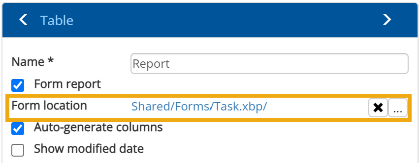 When the new report has been opened, there are a few components are available for building a report: Charts, Tables, Columns, Kanban and Multi-Kanban. A new report starts with a column added. Click to highlight the Report table under the Table of Contents and a 'Form report' checkbox will appear underneath the Table menu in the property inspector, once ticked the 'Form location' will appear with an edit link button next to it. From this button you can choose the form that was created and saved before.