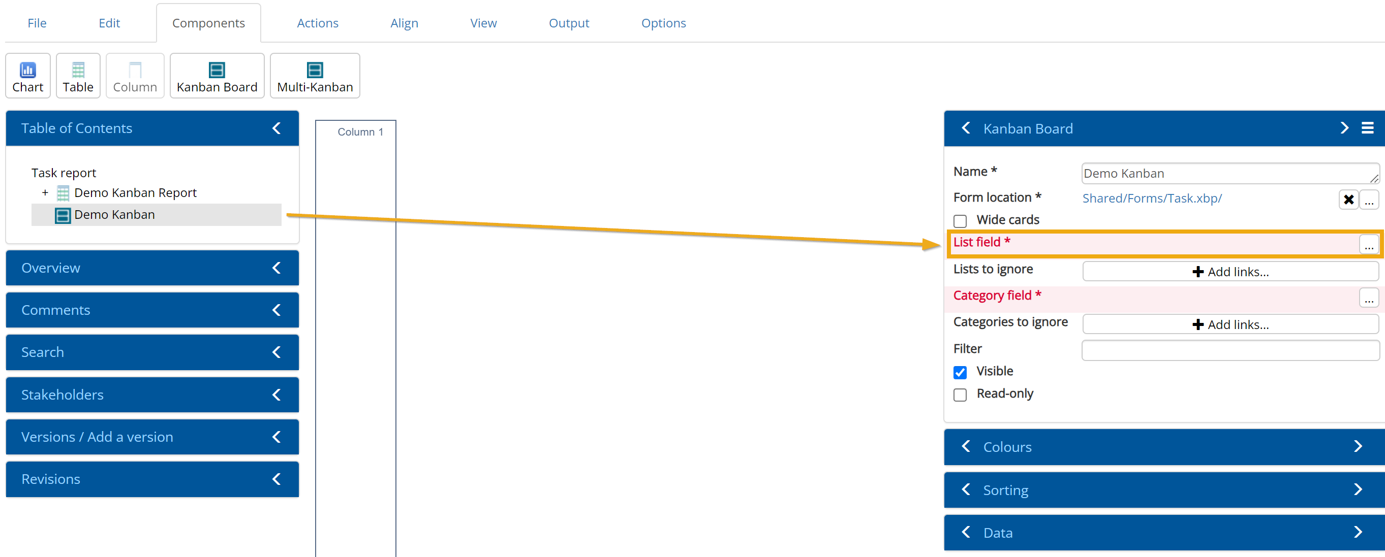 From the Components menu, click to add a Kanban Board to the model. Be sure to name the new Kanban within the property inspector on the right side of the screen. Click the edit link button next to Form location to add the form created to the board. This will link the "card" for use with your Kanban Board.
