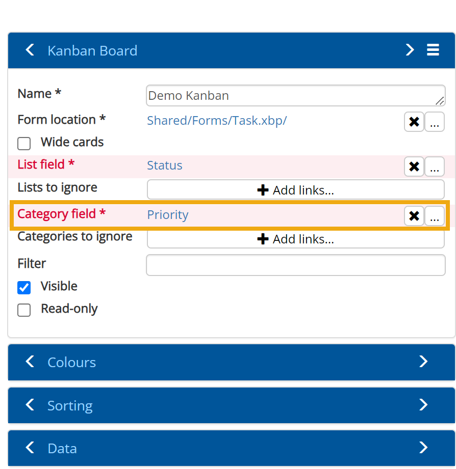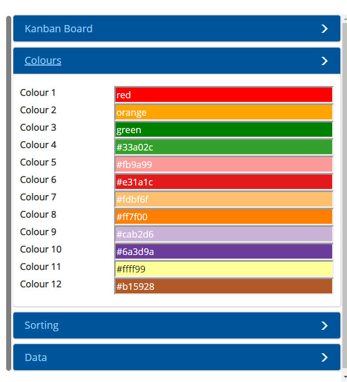 Use the Sorting options to correctly sort cards on the board to properly reflect the visualization. The Data array allows you to select extra data values for text placement inside of or around the Kanban card to view.