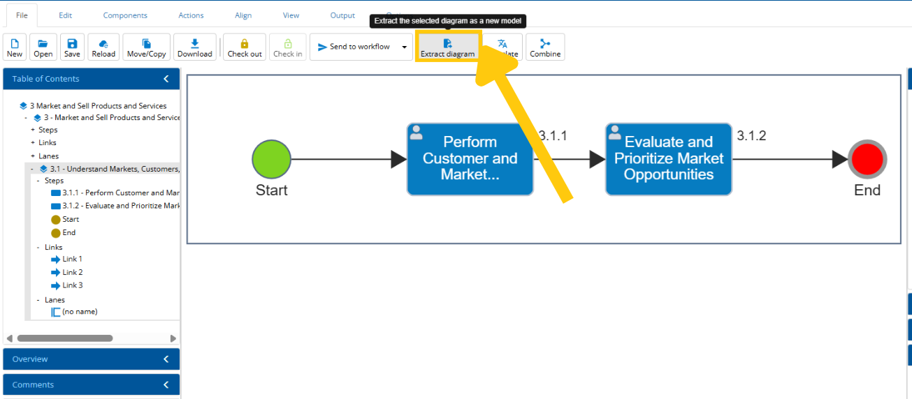 Once the 'Extract' button has been clicked, the process model broken out into a separate process model and no longer be available in the current model.
