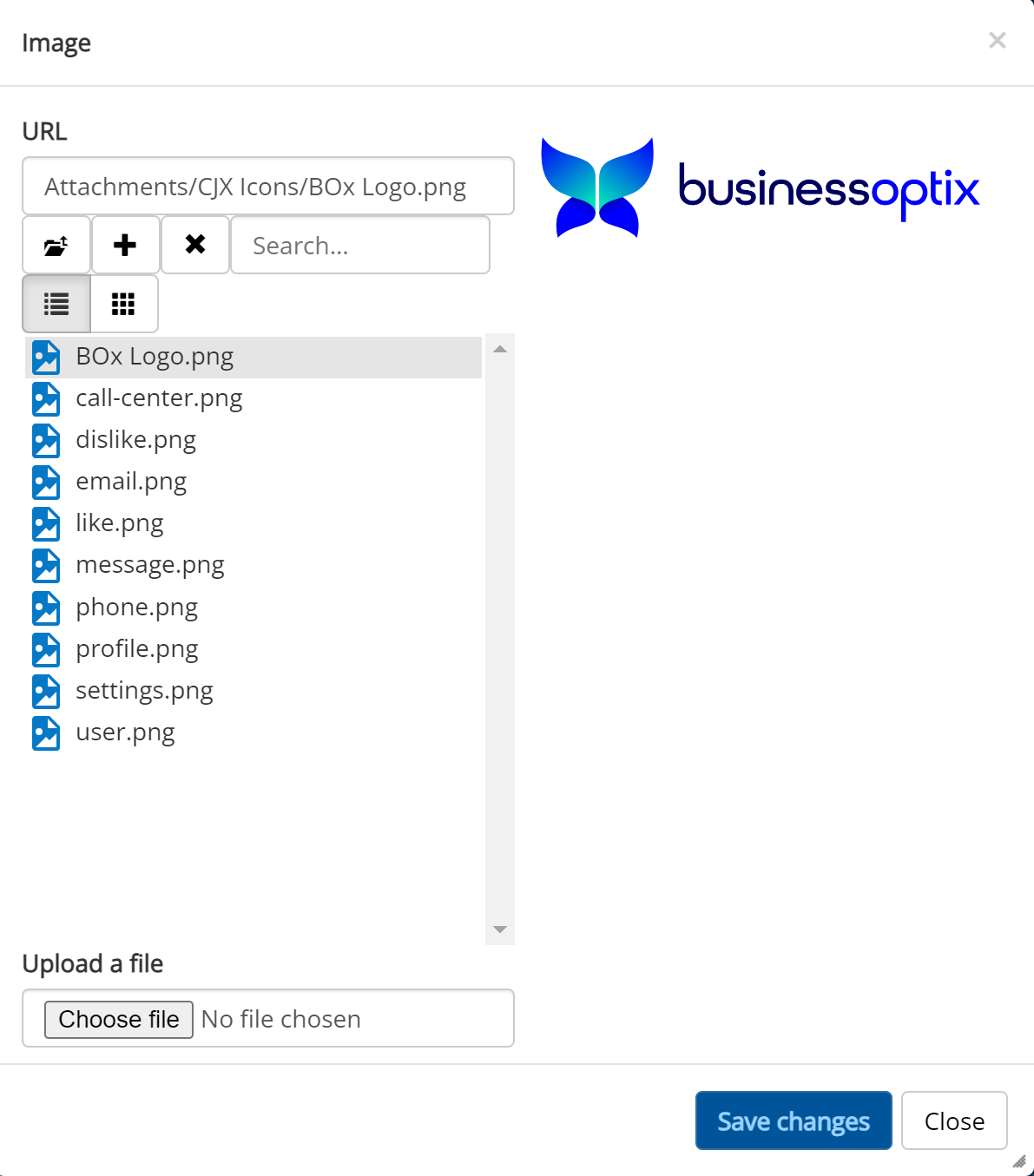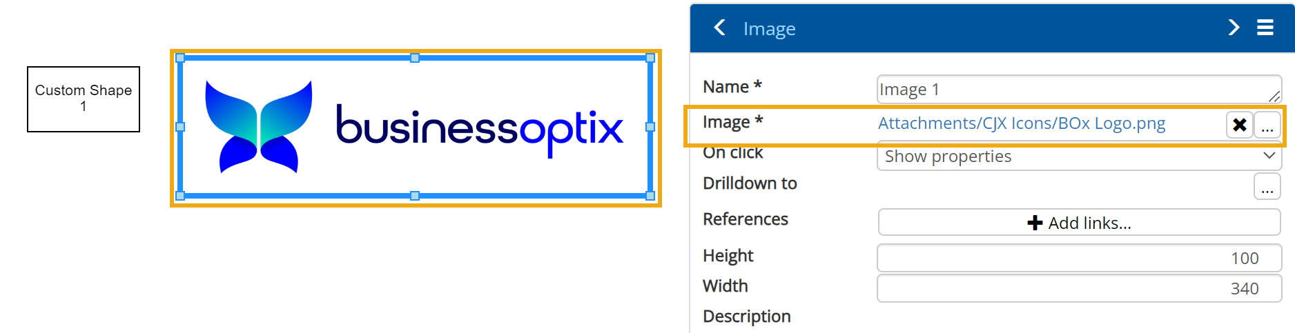 Here, you can choose an image from the BusinessOptix library for it to appear in this Diagram Model.