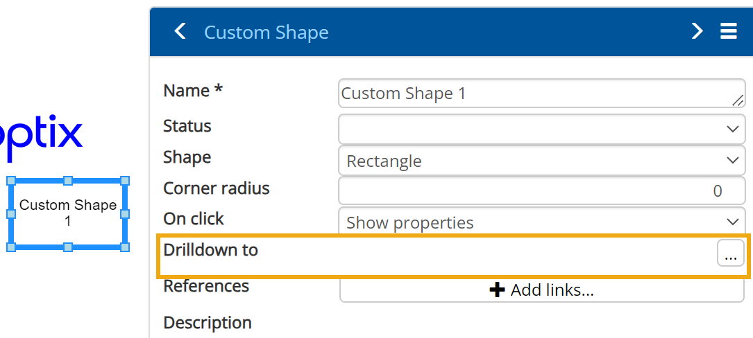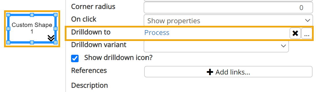 To Drilldown to another model or file, select the component on the Diagram Model and select the edit link button next to 'Drilldown'.