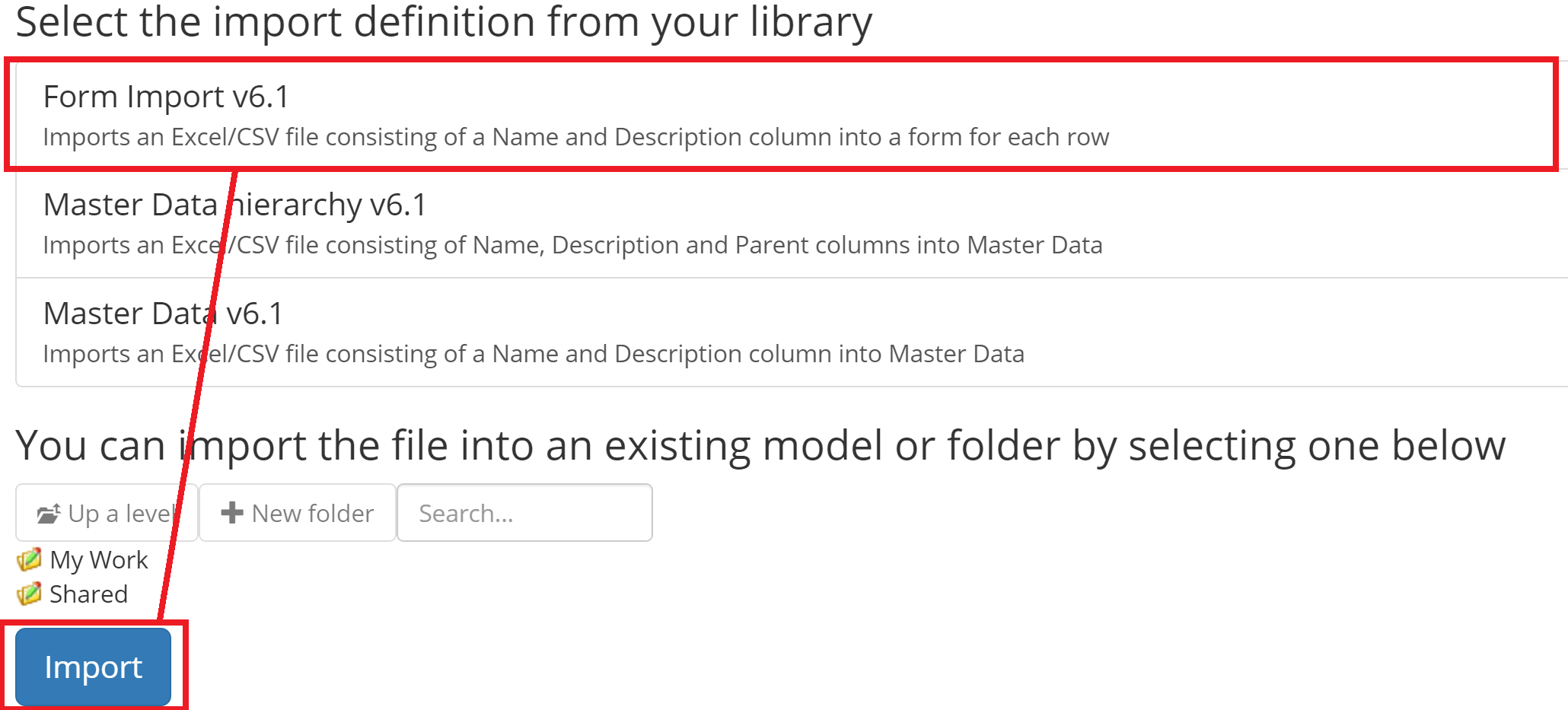 The below options will appear, this may differ slightly depending on your library but you will see the 'Form Import v6.1' entry. Select it and then click 'Import'.