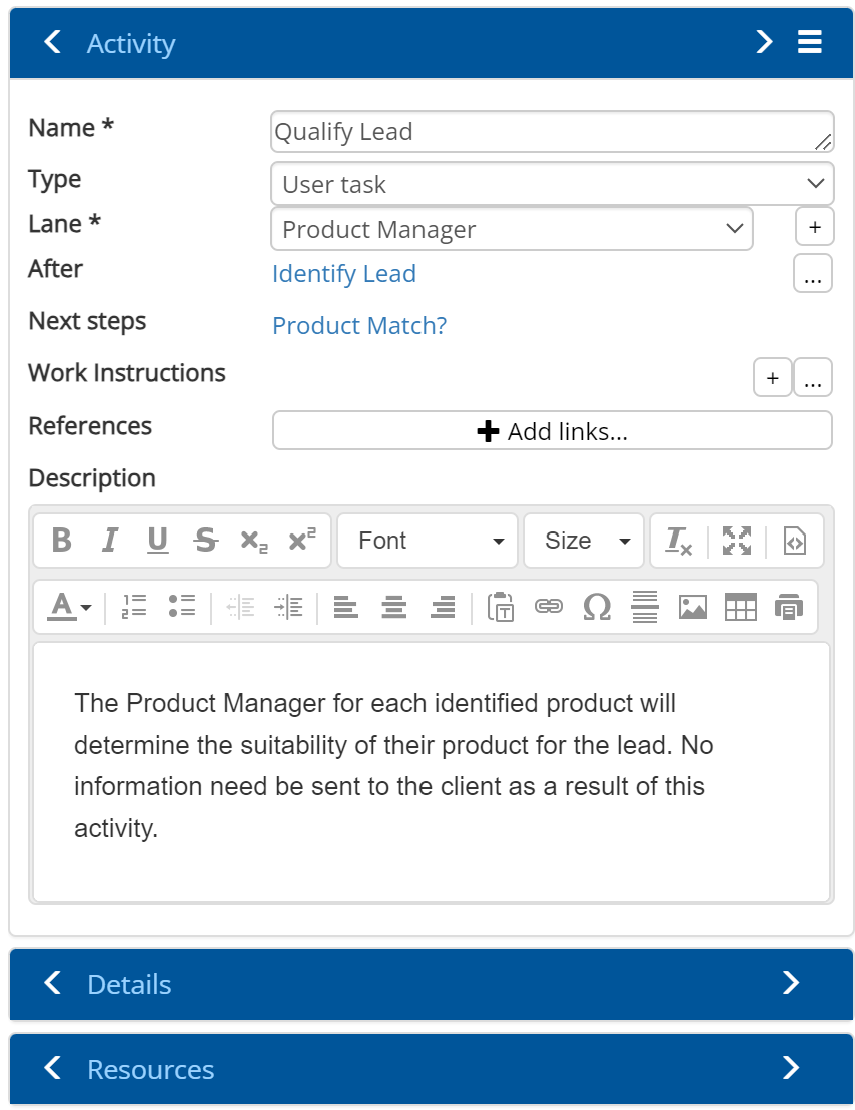 With the standard Process stencil, users can choose Master Data resources for the properties shown above or enter their own “local” resources if no suitable Master Data item exists. Local resources are stored within the model in which they are used, rather than centrally.