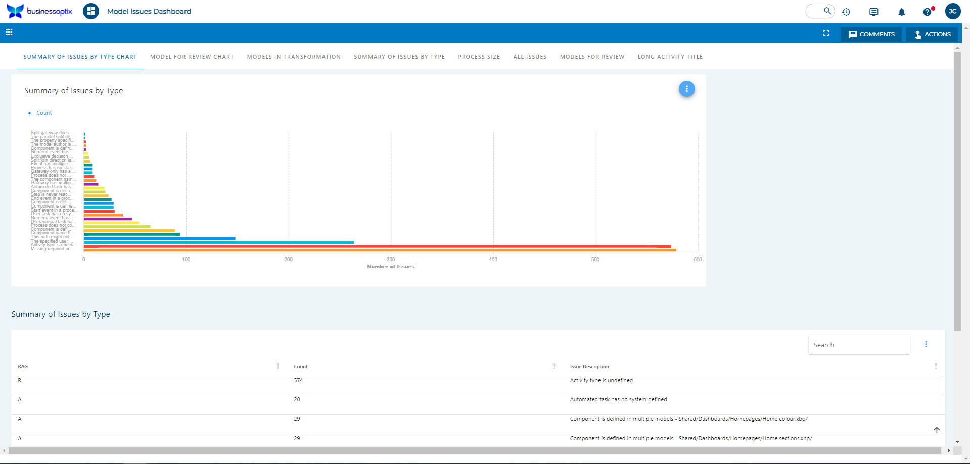 The standard ‘Model Issues’ dashboard offers many views of model resources and can be a useful in creating and maintaining models.