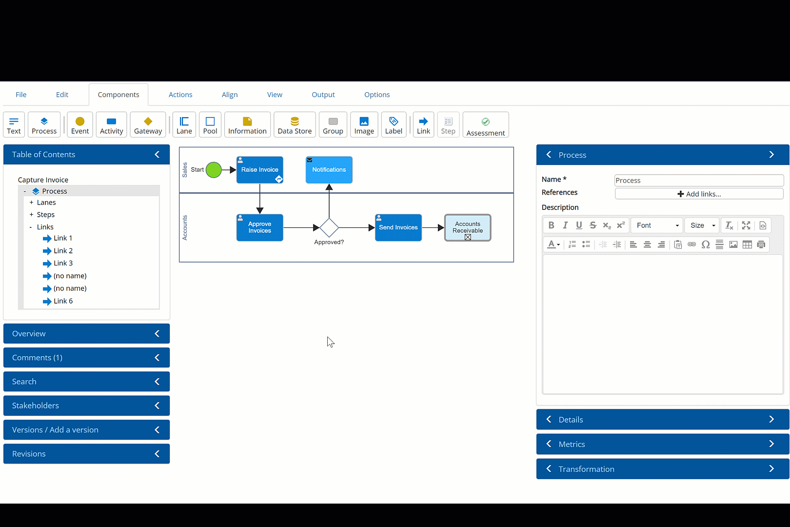 | Process | End-to-end business processes and sub-processes, using the industry standard BPMN notation |