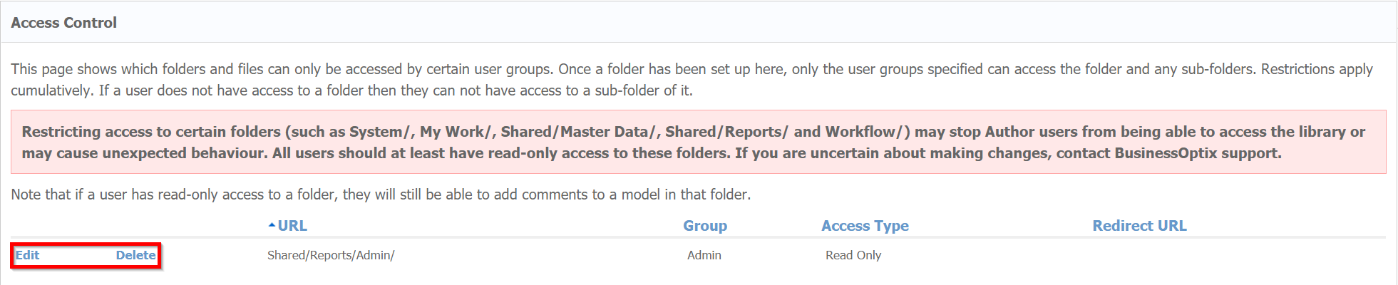 Users have the option to edit any of these details by simply clicking on the 'Edit' button. The changes made can involve the URL of the folder, the group that has access to this folder, if the group have read-only permission to the folder, and if a redirect URL is needed to direct unauthorised users.