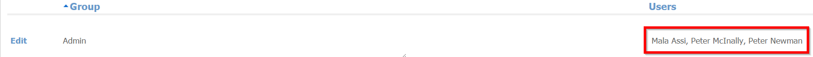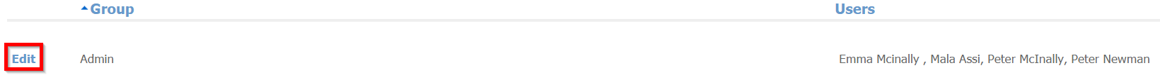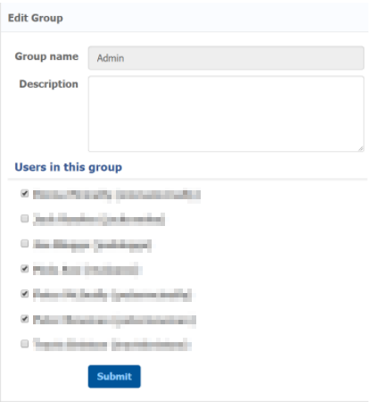Users are given the option to edit the user members in a particular group. Under 'Edit' a description of the group can be added along with choosing which of the user members have access to this group. Each member can be chosen or not using the checklist box next to each of their names. Once the changes have been made, the user saves these changes by submitted the page.