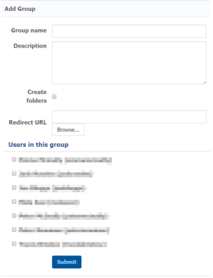Here, a brand new group can be added straight to this library where the group name and description can be added, with an option for folders to be created for this group and a redirect URL. The users who are a part of this new group can be selected from a list of users who already have access to this library.