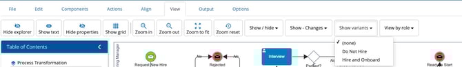 Process path variants can be viewed in Author by selecting the View toolbar and then selecting Show Variants. The appropriately tagged steps will retain their color, all other steps will be shown in grey.