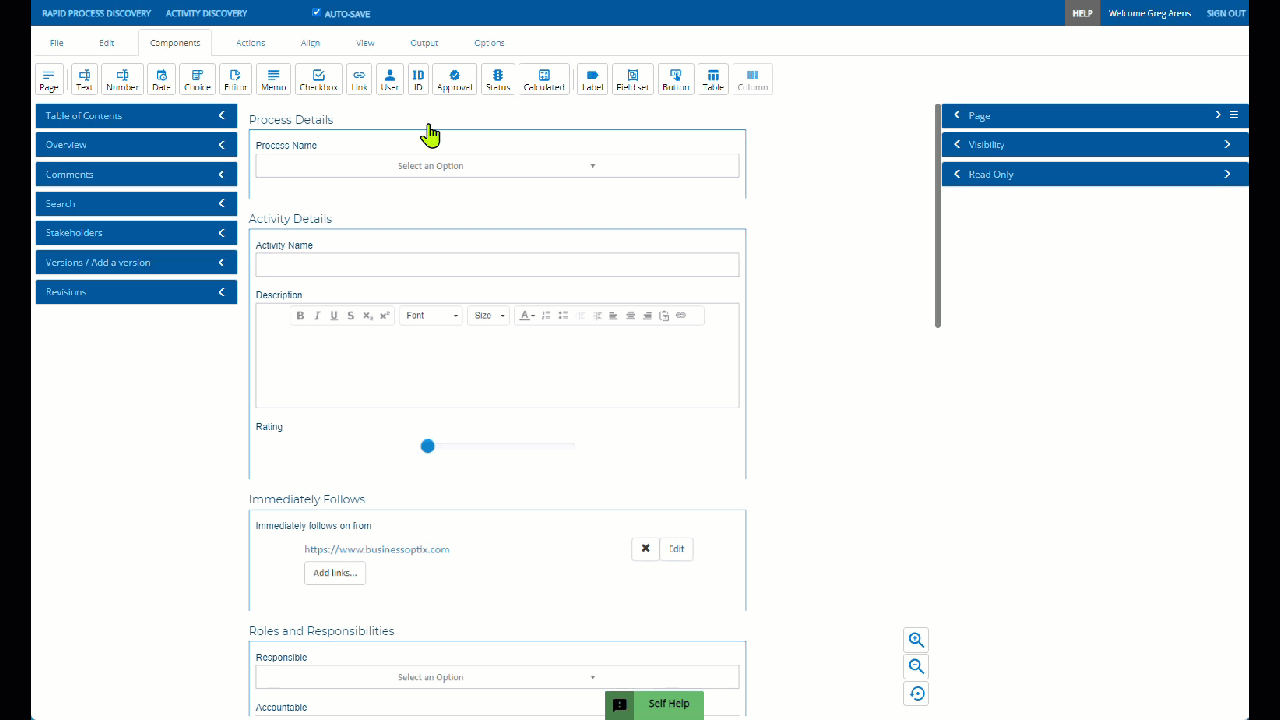 The Rapid Process Discovery Configuration form, the Activity Discovery survey form, and the Rapid Process Discovery Dashboard are pre-configured to work harmoniously within each BusinessOptix library. No additional configuration is needed to begin using the Rapid Process Discovery solution. Should authors need to add configuration to the form it is best to keep it customizing the data fields for gather data, assignment functions of form submissions or updating the governance by selecting the model level details within author design.