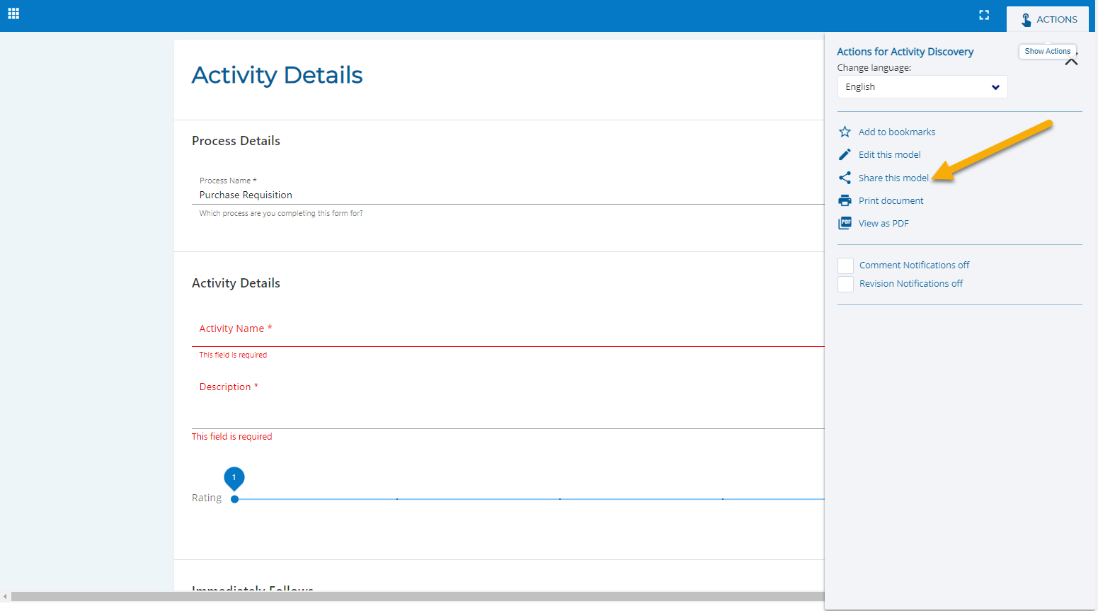 The form is now ready to be sent out to BusinessOptix users for responses. User can be any license type within the platform. On the completed Activity Discovery Form click Actions, then Share this model, then send via email to the relevant users.