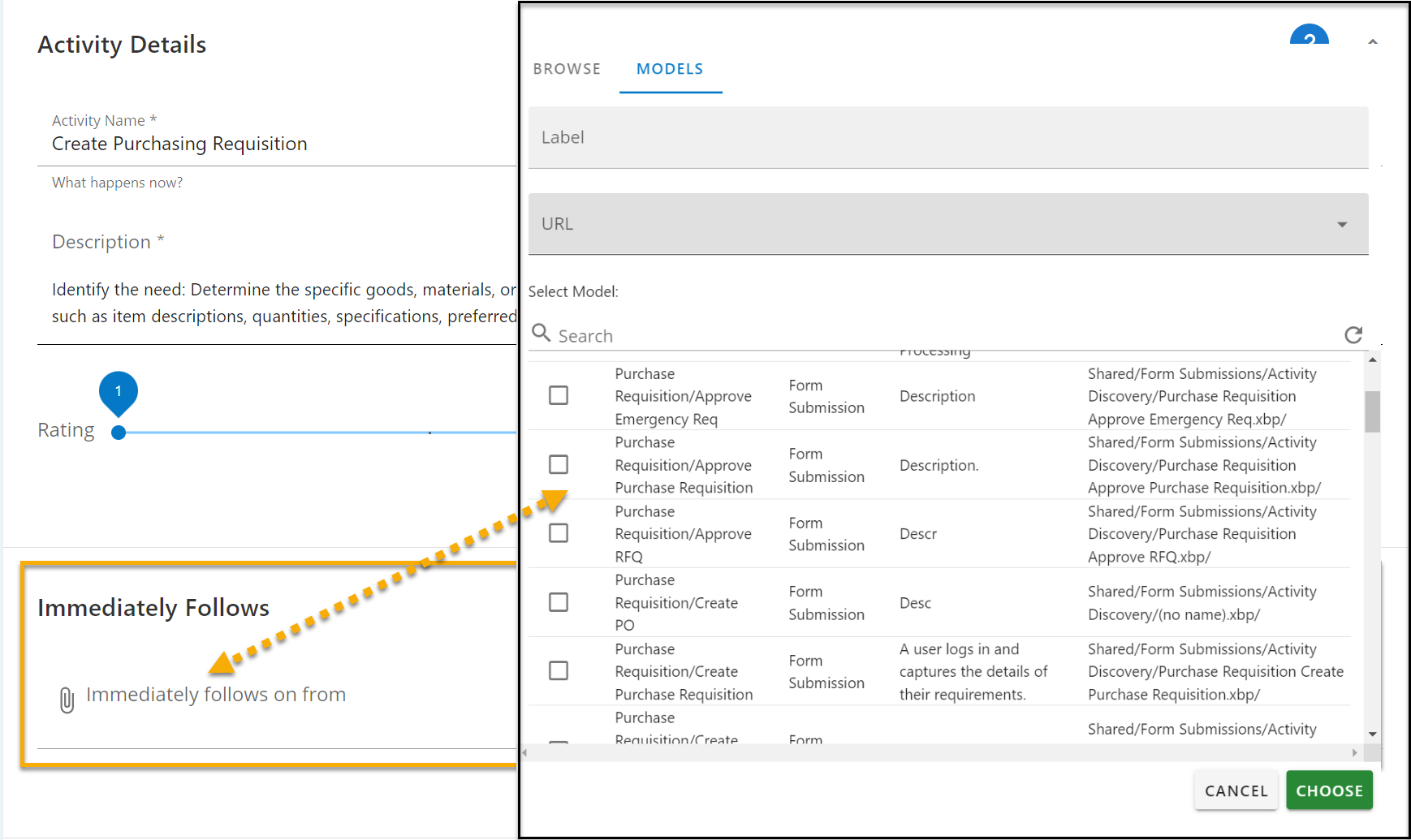 If this is the first activity in the process, users can skip to 'Roles and Responsibilities.' If this is not the first step in the process flow sequence, users can select the the step this activity needs to follow by selecting the previous step from the 'Immediately Follow' list. To do this, click the 'Immediately Follows' section to open a pop-up window and list of previously captured activities. Select the activity from the list that this current activity would follow from. This will help format the responses in activity step order.