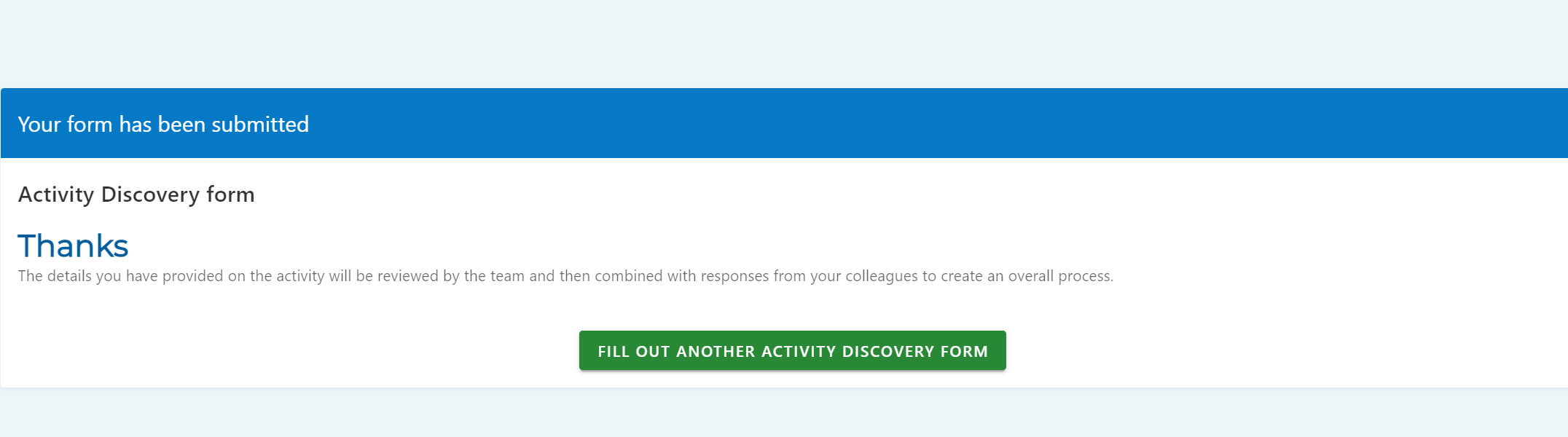 After each submission, users are prompted to complete another activity discovery form to continue documenting the process. If this is the final step of the process, users can simply close their browser or return to the home screen of the library.