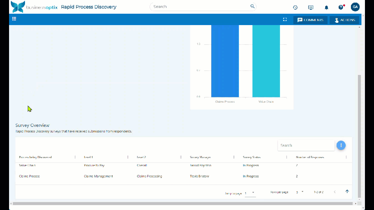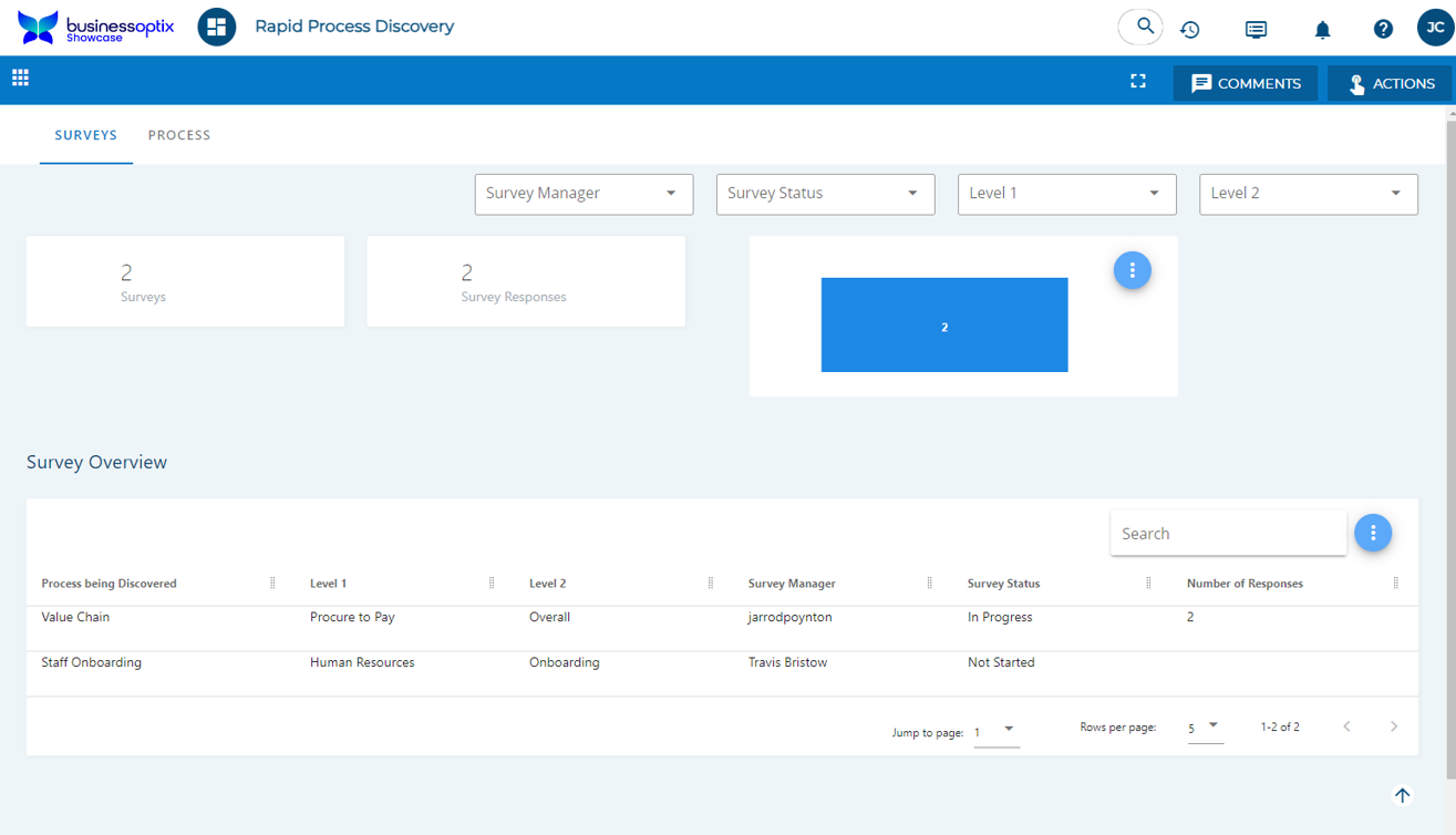 The Surveys page displays an overview of all Rapid Process Discovery campaigns that have been captured in BusinessOptix library. Filtering by Survey Manager, Status or Process levels can be used to narrow the focus of results in the dashboard.
