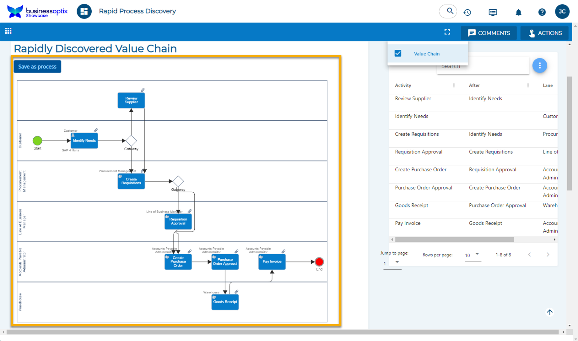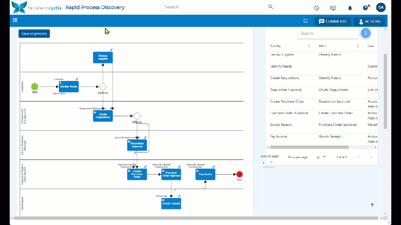 To save this as a process model in BusinessOptix, select 'Save as Process' button in the upper left corner of the flow diagram view. The activity discovery responses will now be converted to activity components laid out sequentially in swim lanes within a BPMN flow map using the author design stencil. From the BusinessOptix design studio, any necessary additions or edits can be made manually onto the full diagram.