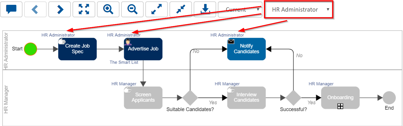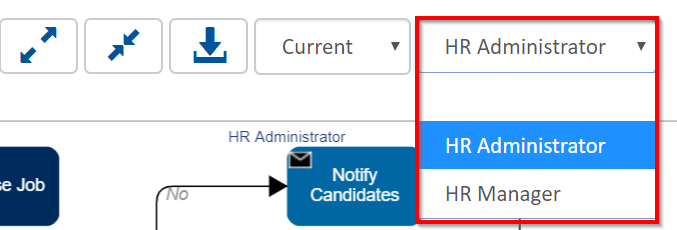 Click on the section highlighted in the image below. This will give the user a drop-down list of all the different roles involved in the process.