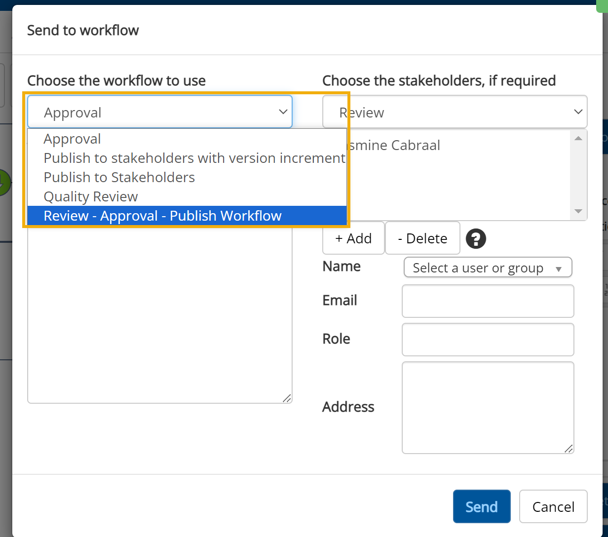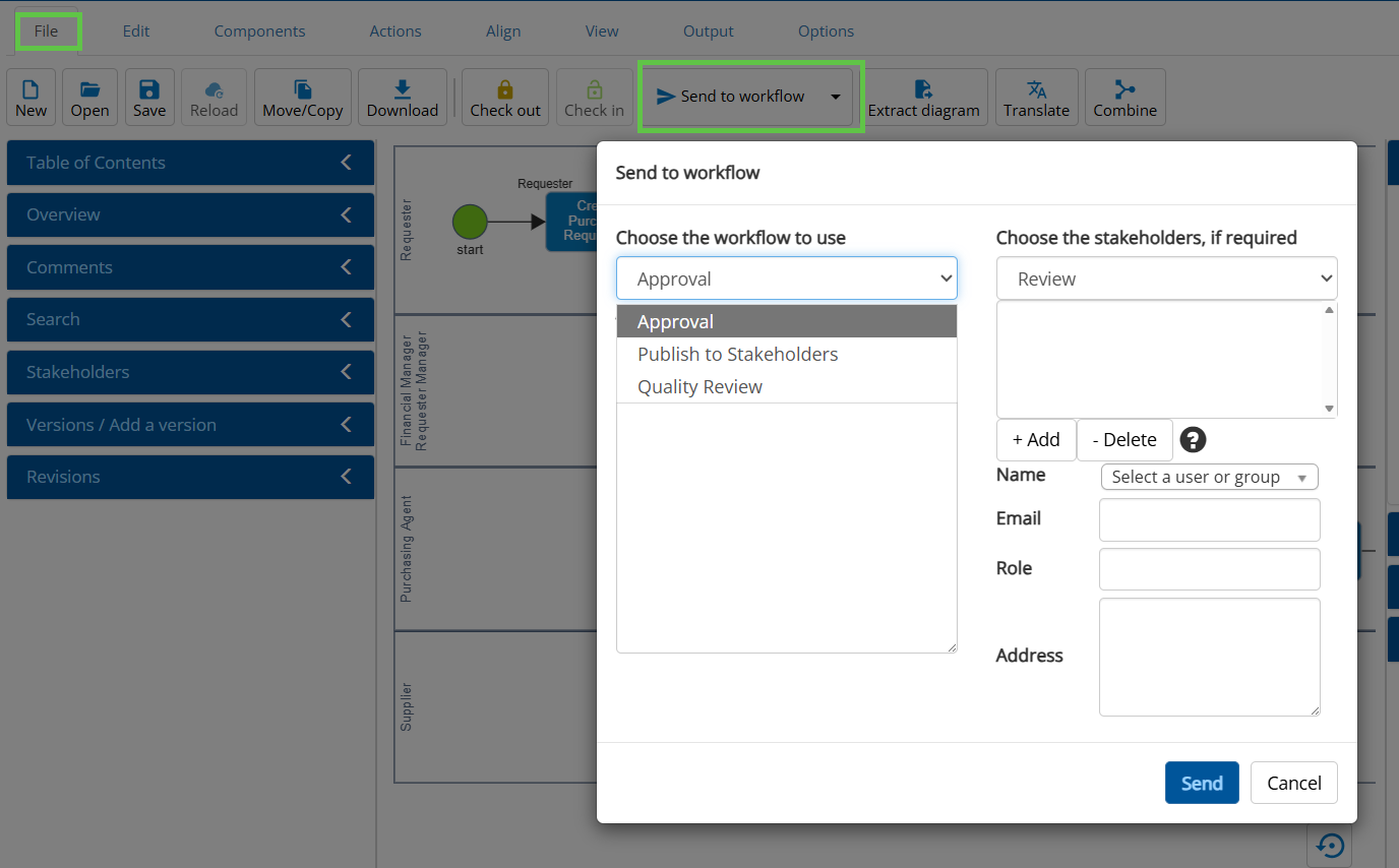 Here, you will have an option of which Workflow process you want to send your model to. When a workflow model has been selected, click the Send button.