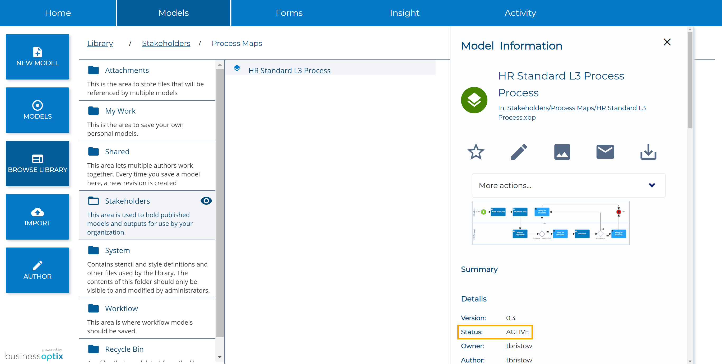 The status of the model has now been changed to ACTIVE, thus it is now published in the BusinessOptix Library.