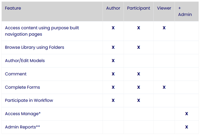 Users in BusinessOptix can be established with one of 3 different license types, additionally a user may also be granted Admin access. Access controls, related to content or features within the library could also be imposed. To provided a simple overview of these configurations please consult the below: